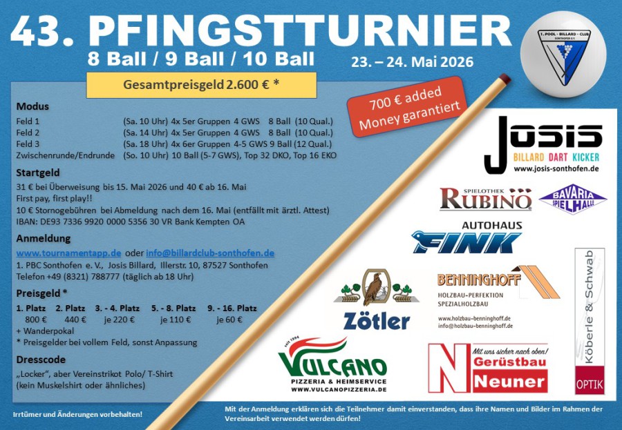 Eine feste Größe im süddeutschen Billardkalender stellt das Pfingstturnier des 1. PBC Sonthofen dar, heuer luden die Oberallgäuer zu ihrem 41. Turnier und wie üblich waren in dem 64-er Teilnehmerfeld wieder zahlreiche Spitzensportler aus dem Süddeutschen Raum vertreten, gekrönt wurde dies durch die kurzfristige Meldung von Tobias Hoiss und Mario Gulic vom Bundesligisten BSV Dachau und den Regionalliga-Spielern Anastasios Kiriakidis vom BC Aalen sowie den Brüdern Ivan und Luka Galic vom BSV Filderstadt. In den Vorrunden konnten sich die meisten der Favoriten noch durchsetzen, leider konnten sich dann jedoch nur 5 Spieler des PBC für die Top 32 am zweiten Tag qualifizieren, nämlich Alex Stöhr, Mario Baude, Jens Fischbach, Stephan Winter und Alex Keist.